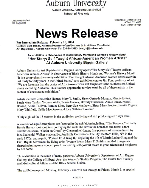 Artists include: Clementine Hunter, Mary T. Smith, Sister Gertrude Morgan,